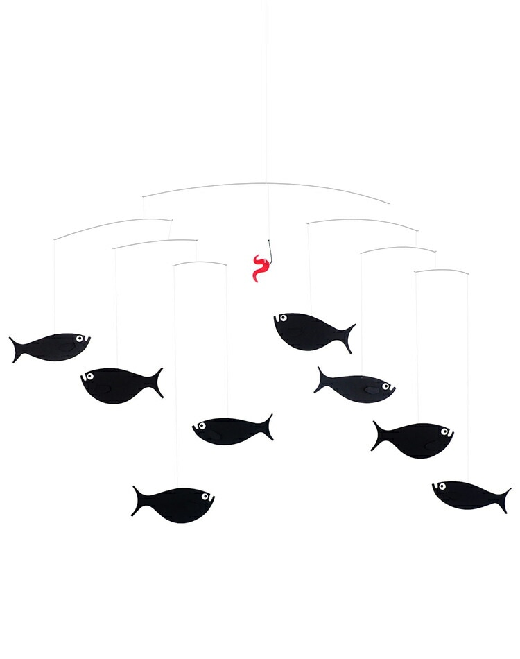 8匹の黒い魚の中にミミズの赤がアクセントになったシックな配色のため、インテリアに馴染みやすく可愛い魚たちがスイスイ泳いでいる姿が楽しめるモビールです。