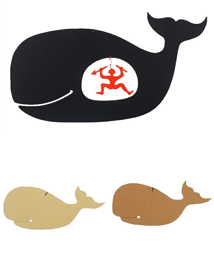 鯨捕りのヨナが神様との約束を破り鯨に飲み込まれてしまいます。銛を折り改心したのを鯨は微笑み受け入れるという旧約聖書のお話をもとにつくられたモビール。