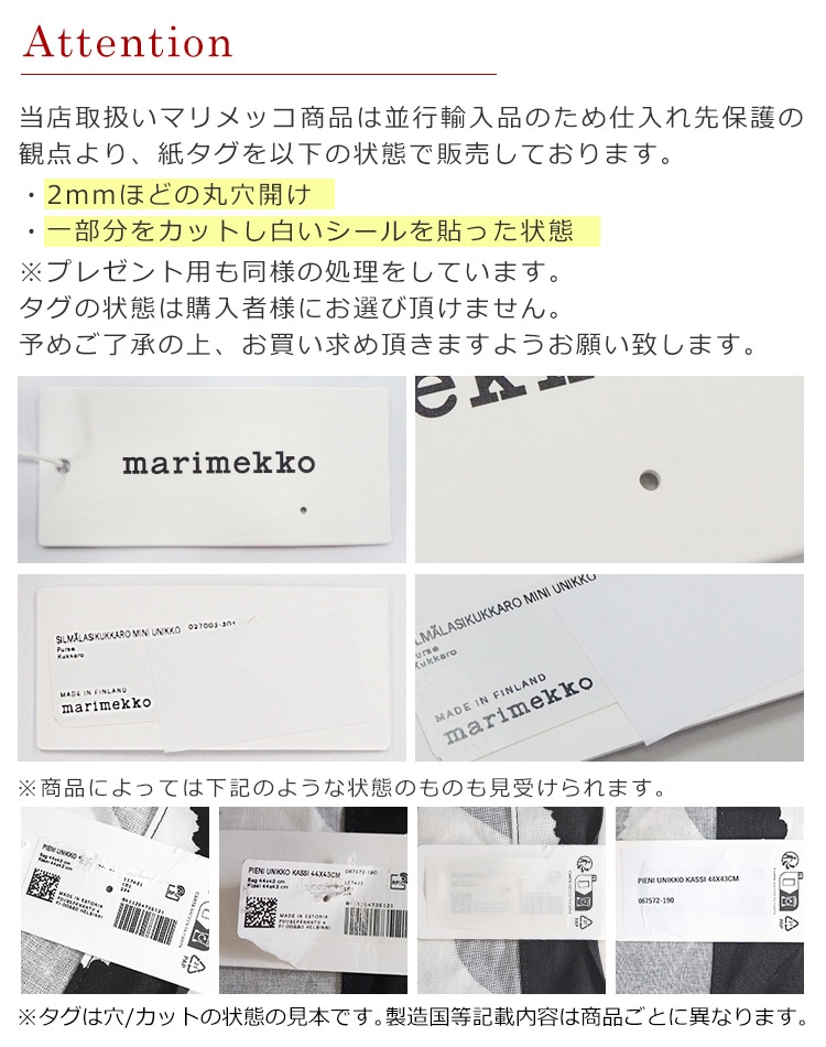 当店取扱いマリメッコ商品は並行輸入品のため仕入れ先保護の観点より、紙タグを以下の状態で販売しております。
