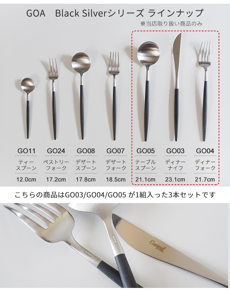 ディナーナイフ・ディナーフォーク・テーブルスプーンの3種類が各1本ずつ合計3本セットです。